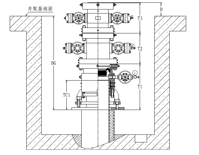 3.1.2 校核導(dǎo)管割口高度:導(dǎo)管割口高度確定后,校核每次套管頭安裝口鉆井四通旁通口中心線的高度,以保證每次套管頭安裝好后內(nèi)控管線都能平直接出鉆井底座。如果不能滿足上述條件,則要調(diào)整尺寸D,直至滿足要求。