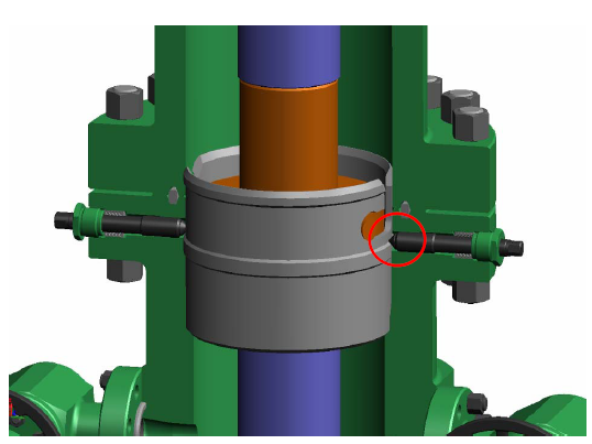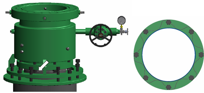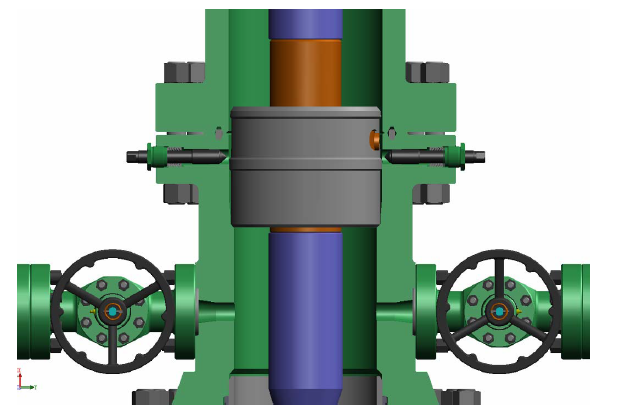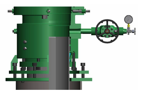 3.3 法蘭殼體兩側(cè)面有兩個(gè)對(duì)稱的,符合 API 6A 標(biāo)準(zhǔn)的 2LP 旁通接口,分別裝有緩沖器和壓力表,可用來檢測(cè)環(huán)空壓力和可用來補(bǔ)擠水泥或釋 放兩層管柱之間的壓力及進(jìn)行其他作業(yè)。