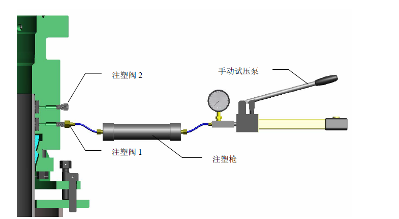 3.6.2 將觀察孔1的注塑閥卸掉,把對(duì)應(yīng)的另一側(cè)注塑閥1的護(hù)帽卸掉,接試壓槍。